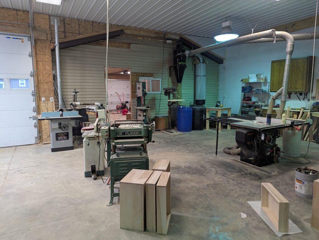My wife was from the Erie, PA area, and when we got married, I moved to her area. For a few years, I worked as in sales/design at Haines Printing, and at first, I had no definite plans of doing woodworking again. I had an empty shop at the place we purchased, and it didn’t take long for the nostalgia of sawdust to prompt me to start buying a few machines. It also didn’t take long for local friends to find out, and cabinetry projects started trickling in. I’d spend my evenings and Saturdays in the shop and gradually purchased more machinery from auctions until I had a fully functional kitchen shop.